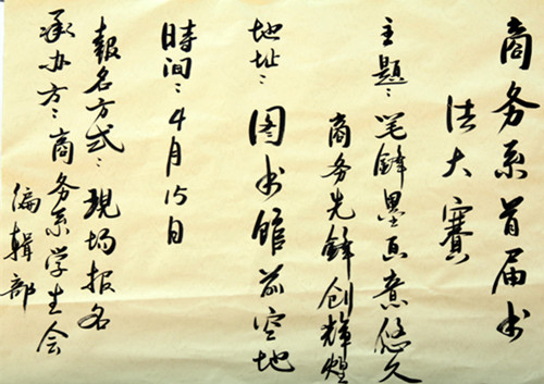 本次活动是商务系第二课堂活动的一个延伸,得到了师生的大力支持。笔锋墨画意悠久,商务先锋创辉煌!举办这样的活动,培养同学们的书法爱好不仅可以陶冶个人的性情,树立高尚品德,而且对个人的耐心与恒心也会有所帮助,还为校园文化建设增添了一道亮丽的风景。(商务系党总支供稿)