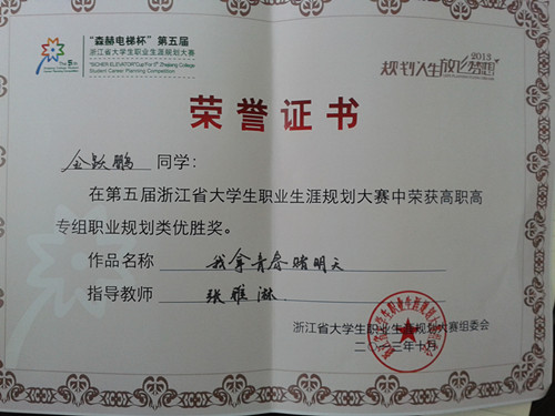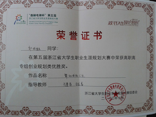 2013年10月28—31日,由浙江省教育厅主办的第五届浙江省大学生职业生涯规划大赛决赛在杭州举行。全省共有98所高校报名参加省级复赛,提交职业规划类和创业规划类参赛作品540余份。我院第一次参加该项比赛,学校有关领导高度重视此项赛事,就业创业教研室与各系部领导积极动员、精心组织,通过系部、院级选拔,共推荐5位学生参加省级复赛。经过初赛、培训、复赛等多个环节的激烈角逐,我院管理系张雅淋老师指导的三位同学的规划作品:沈健的《鸿鹄得志,必将高飞》、金跃鹏的《我拿青春赌明天》、徐亦博的《迈步人生,放飞梦想》,贸易系黎国英等老师指导的郁思琦同学的规划作品《我的未来不是梦》、于遵萍等老师指导的郭纯漂同学的规划作品《舞动我的人生》获此次比赛优胜奖。
