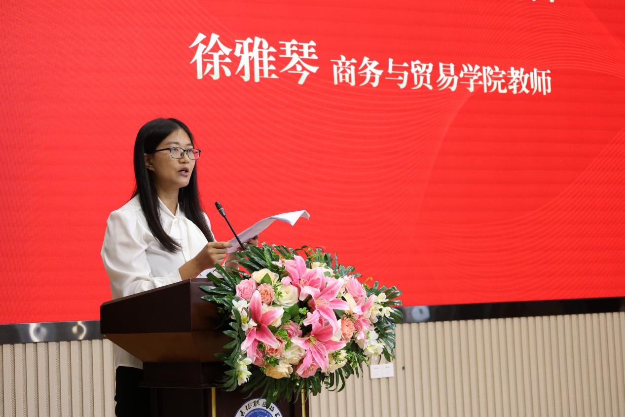 表彰结束后,商务与贸易学院教师徐雅琴作为受表彰人员代表上台发言。她结合自身工作实际,分享了在教学、科研等方面的经验和感悟,表达了对党的感激之情和对未来工作的坚定信心。