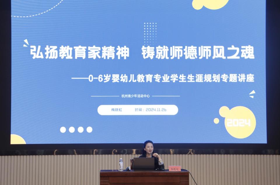 为深入贯彻全国教育大会精神,弘扬教育家精神,加强学前教育专业师范生师德师风建设。近日,人文与教育学院邀请杭州市青少年活动中心Do都城少儿社会体验馆教学馆长梅晓虹开展了“弘扬教育家精神,铸就师德师风之魂”学生生涯规划专题讲座。人文与教育学院常务副院长葛玲妹、教师代表及学前教育(师范)专业全体学生参加。讲座由学前教育专业教研室主任黄敏敏主持。