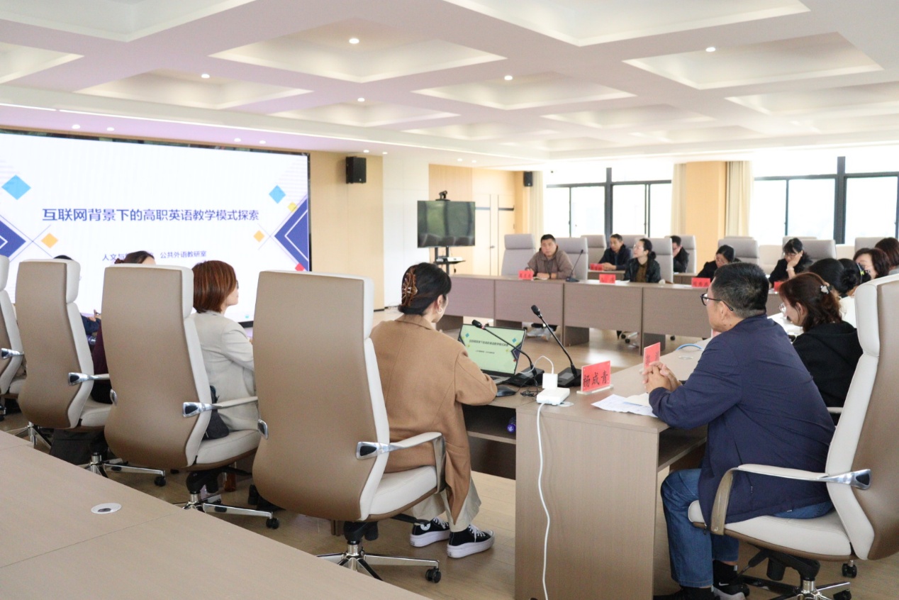 下午,双方在行政楼第一会议室举行专题交流研讨会,会议由公外教研室主任王秋老师主持。会上,潘雅辉介绍了人文与管理学院的发展历程、办学特色及大学英语教学情况。王秋以《互联网背景下的高职英语教学模式探索》为题,系统介绍了学校《基础英语》和《大学英语》两门课程在课程设置、教学模式、评价体系及教学育人成果等方面的实践与经验;同时,围绕高职英语教学中存在的现实问题与对策,与诸暨市职教中心的老师们展开了深入探讨。